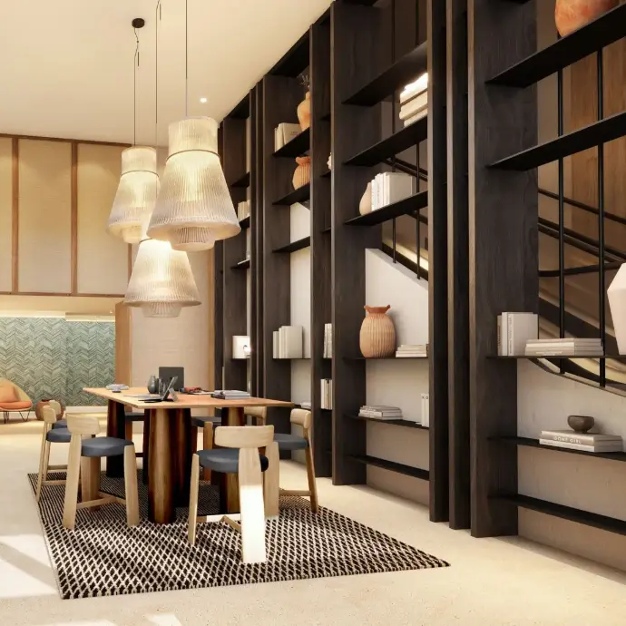 Fixed Furniture for common areas, comprising a total of 95 elements including wardrobes, counters, ornamental screens, common tables, shelving units, planters, sofas and vanities.