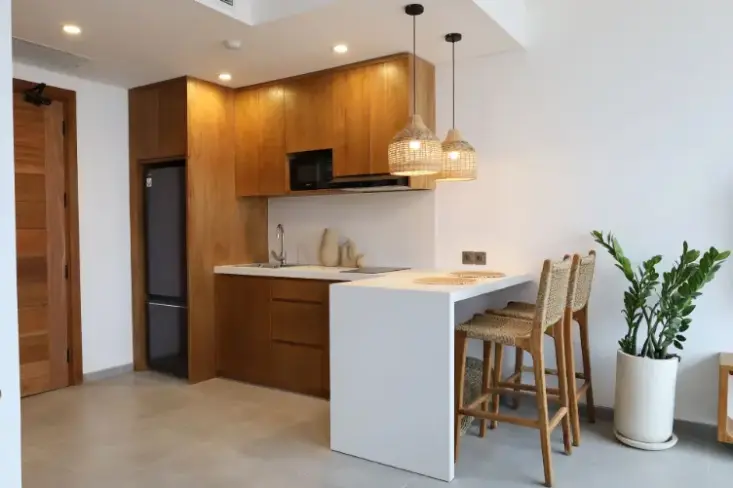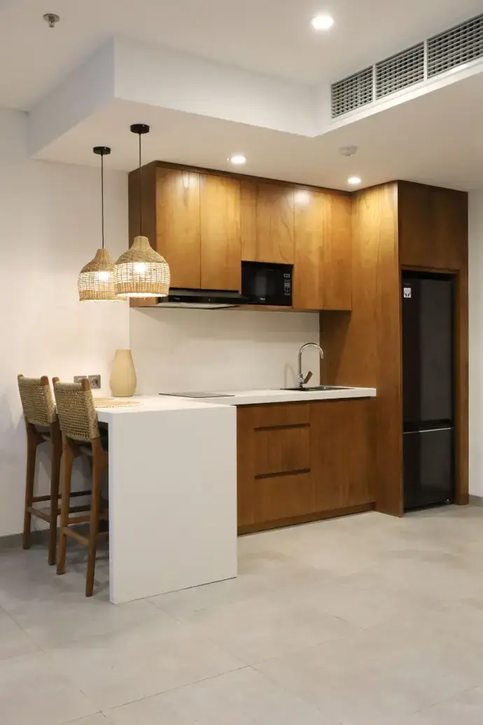 Our team produced and installed wardrobes, kitchen units, and vanities across both Sunny Aparts II and Sunny Muse. For Sunny Muse specifically, we also created a full hallway paneling feature to add warmth and texture to the transitional space.